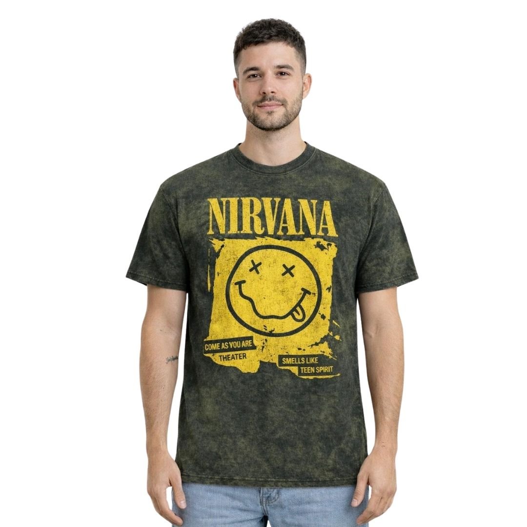 Vintage yıkamalı Nirvana smiley baskılı unisex tişört. Günlük ve rock tarz kombinler için ideal.